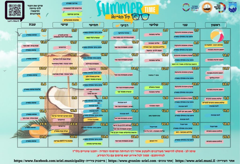 הקיץ הוא הזדמנות נהדרת לצאת לבלות יחד, להנעים את שעות הפנאי, לתרום לחיזוק קהילות וליצור חוויות משפחתיות. לכן דאגנו למגוון האוכלוסיות והגילאים. תבואו ותהנו, מחכים לכם!